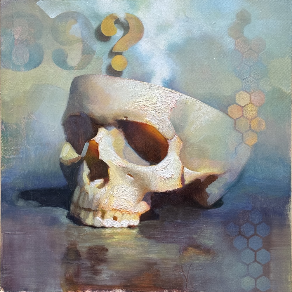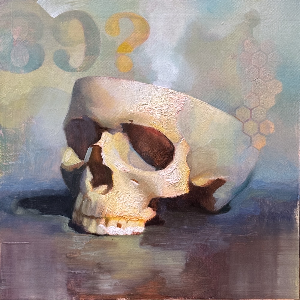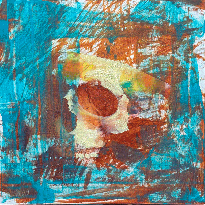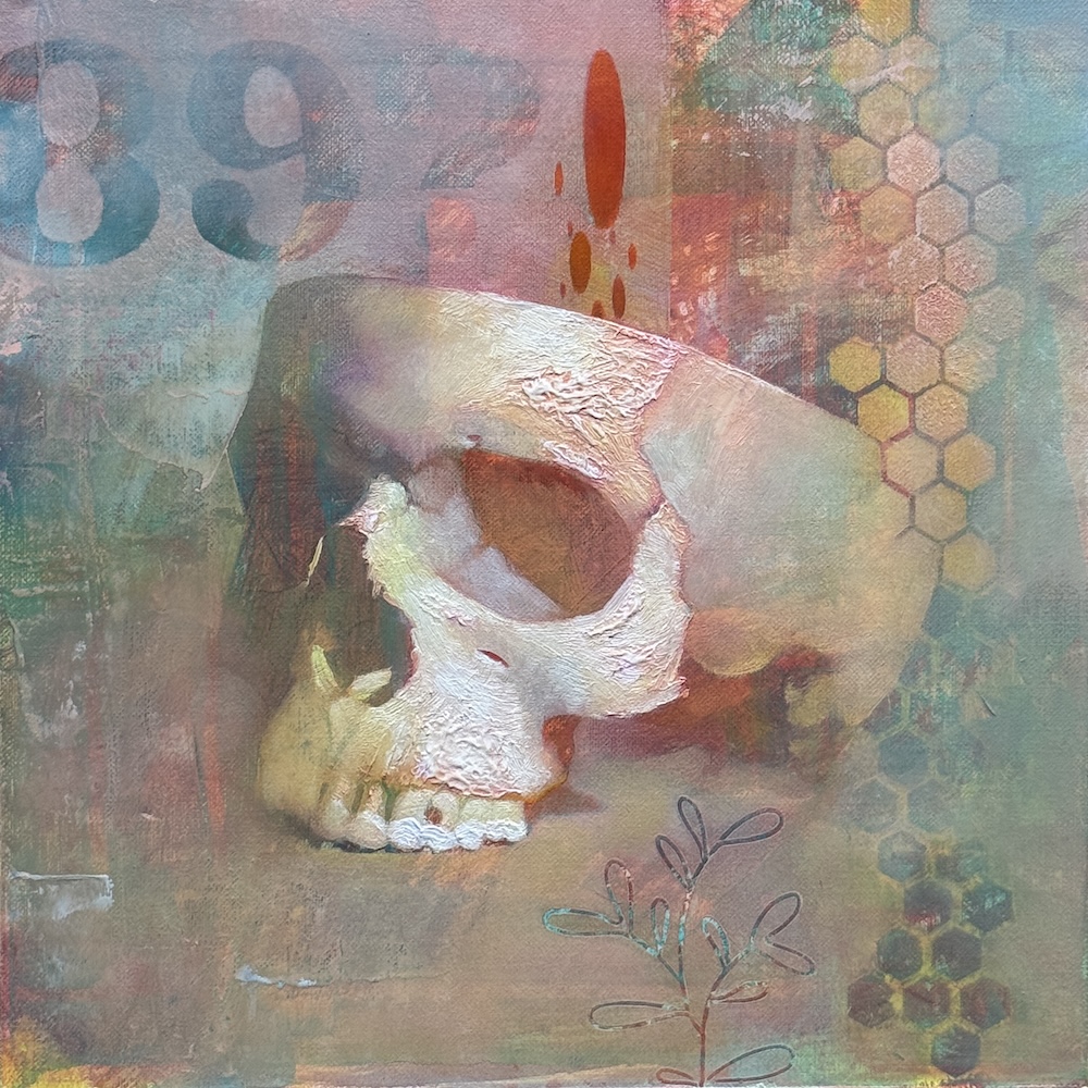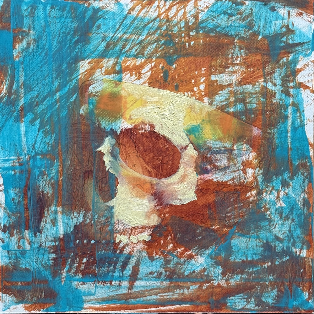 The crazy chroma was annoying me so you can see a lot of scumbling/neutralizing/unifying going on here. I also did a bit of glazing pinks onto the skull and then wiping away. I liked the effect from the first iteration of the blue paint kind of being elevated out fo the skull so I recreated that with red. While inherently less hacky, it is a bit more boring. I’m using too many randomy styles or approaches to the skull but my colors are now pendulum swinging back to reality, which may or may not be a good thing.