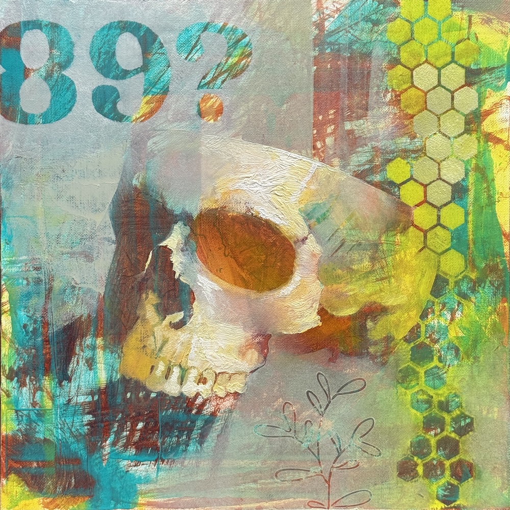 Using mostly just straight paint, I stared adding the neon yellow with some stencils and glazing but then I felt like it was just turning into a crazy chromatic mess. I tried adding in additional neutral greys. I used a little palette knife action to define the left side of the skull and reverse-added the numbers. I also glazed some oranges and yellows onto the texture. Again, just kind of winging it and not sure what i’m doing.